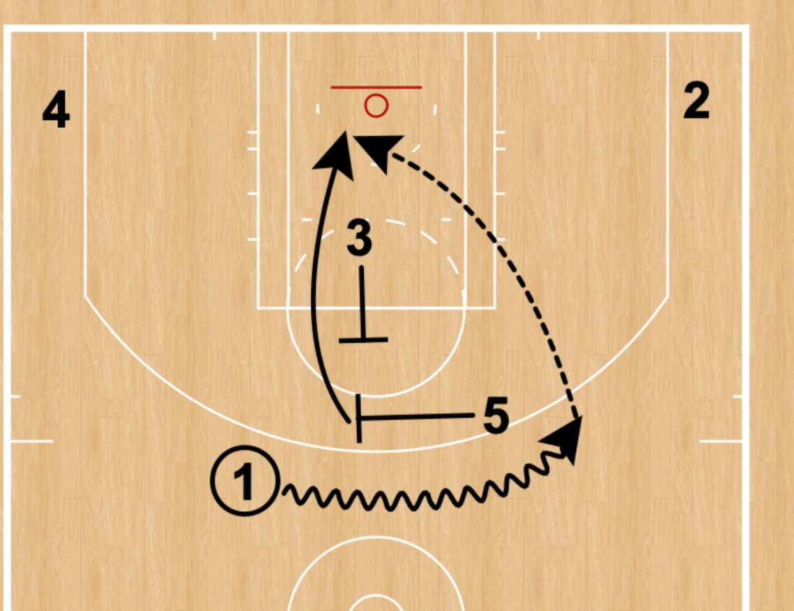 As (1) comes off the ball screen, a third player (2) sets a backscreen on (5)’s defender (X5) — who is usually the drop defender.